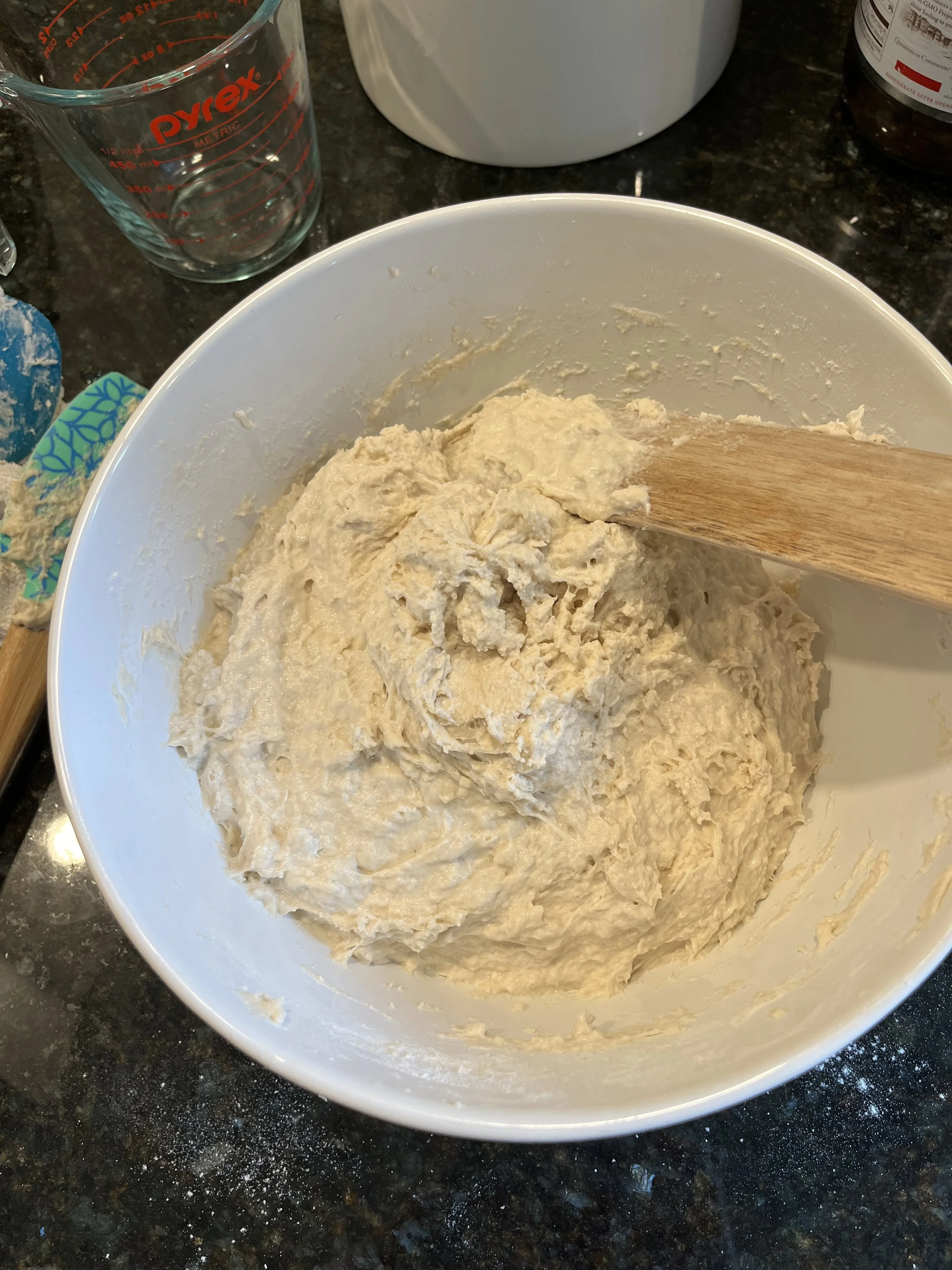 What do I mix with? I started with just a wooden spoon and scraped the sides with a falling apart bowl scraper tool, but you can fancy-up with this Baker’s whisk, which is something I have now!